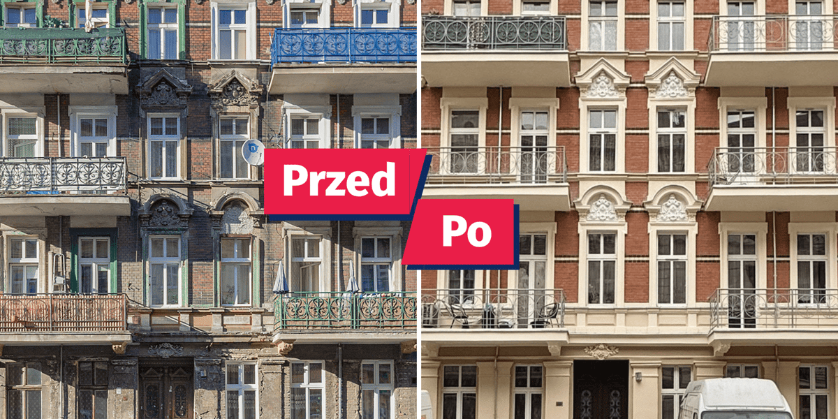 A jak jest teraz? Czysta, jasna fasada, pięknie podkreślone detale architektoniczne, odrestaurowane sztukaterie nad oknami, balustrady balkonów i drzwi wejściowe.