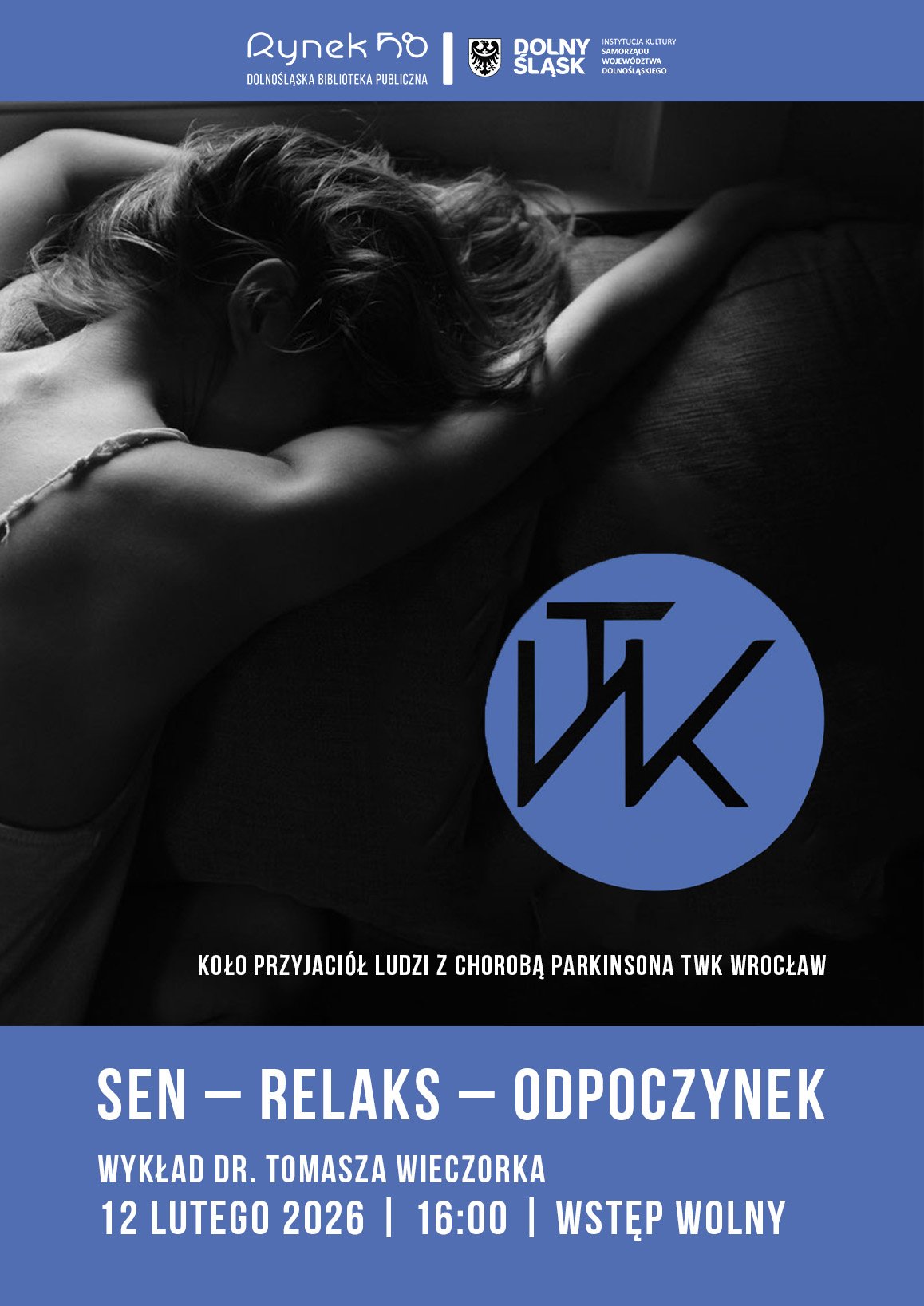 Plakat wydarzenia. W górnej części czarno‑białe zdjęcie osoby leżącej na łóżku w pozycji odpoczynku. Na środku znajduje się niebieskie koło z czarnym logotypem TWK.