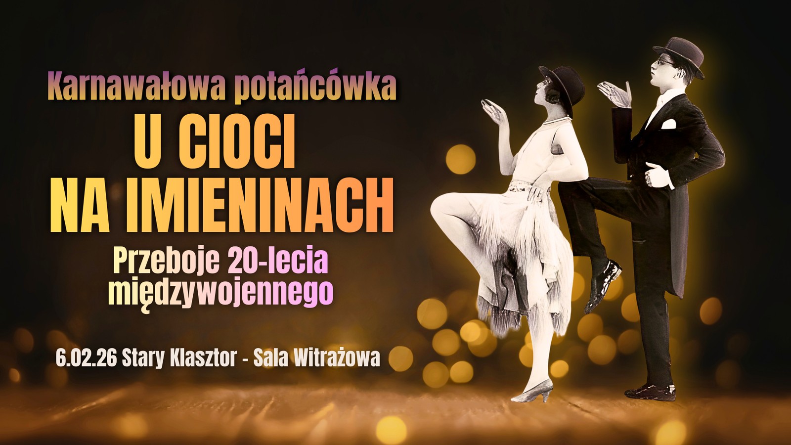 W karnawałowy piątek, 6 lutego 2026, zapraszamy do Starego Klasztoru na wyjątkową potańcówkę w rytmie największych polskich przebojów z lat 20. i 30. XX wieku.
