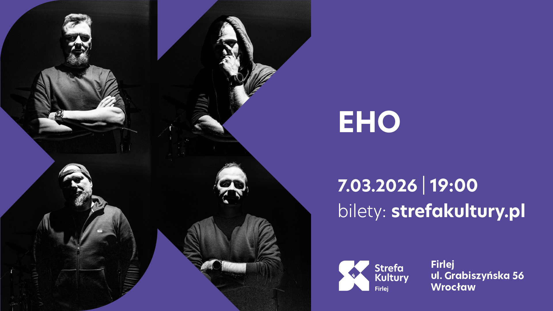 EHO powstało w 2024 roku, kiedy czterech wrocławskich muzyków po różnych życiowych przygodach uznało, że pora wrócić do brzmień, które kształtowały ich młodość. Nie wracają jednak do nich z nostalgią. Bardziej z impulsem, który przypomina odkorkowanie wina nabierającego zupełnie nowego smaku.