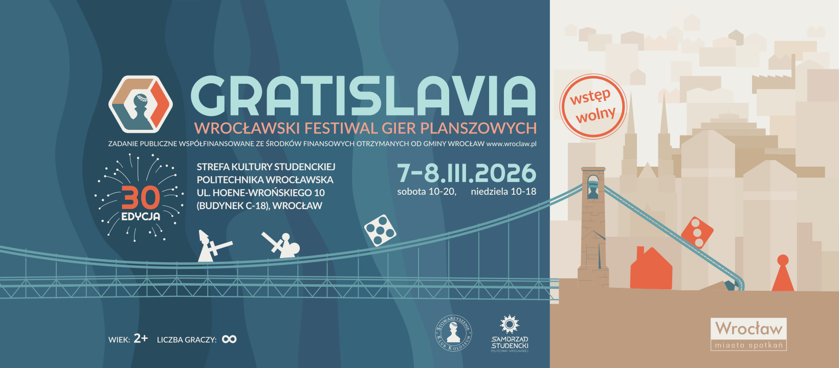 W najbliższy weekend, 7-8 marca 2026, w Strefie Kultury Studenckiej (ul. Hoene-Wrońskiego 10, Wrocław) odbędzie się już po raz 30. Festiwal Gier Planszowych Gratislavia. Wstęp na wydarzenie jest bezpłatny.