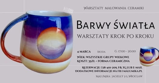 Zapraszamy na wyjątkowe warsztaty malowania ceramiki inspirowane tematyką barwy światła. W trakcie spotkania będziemy eksperymentować z przejściami tonalnymi, efektem rozświetlenia, cieniem i nastrojem koloru, tworząc na kubkach, talerzach lub misach kompozycje oddające klimat różnych pór dnia.